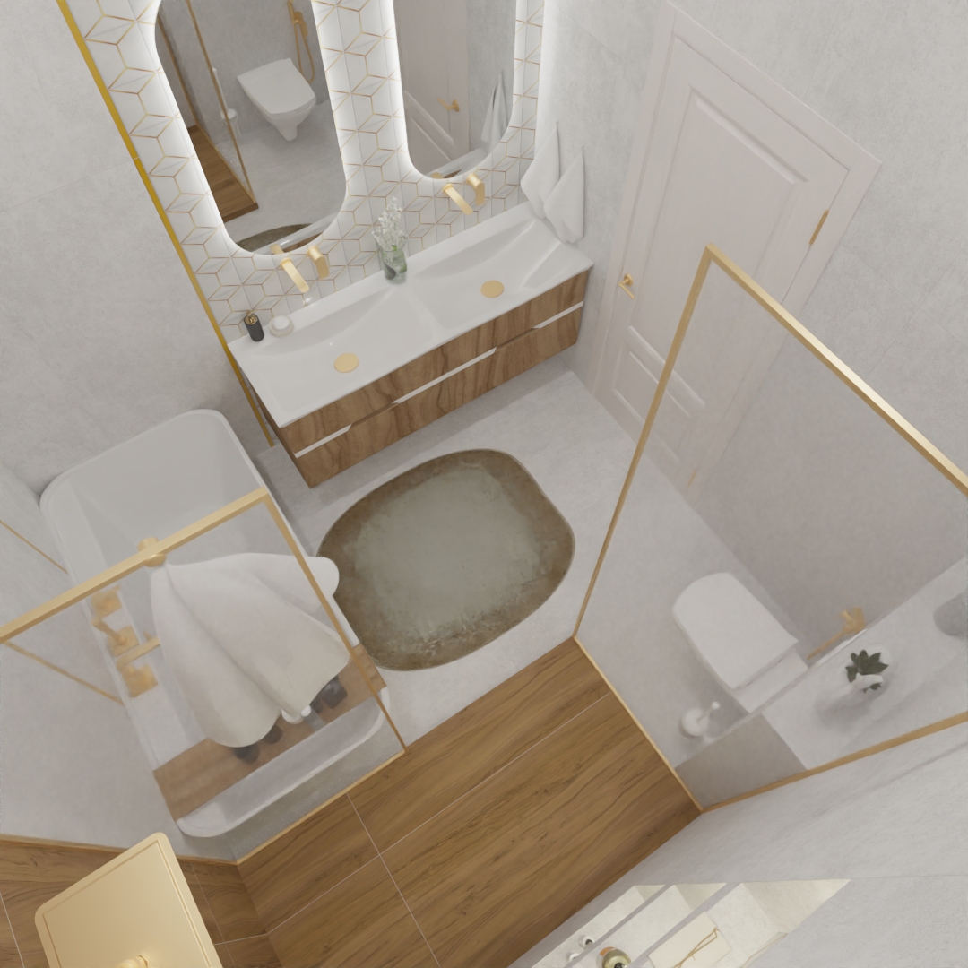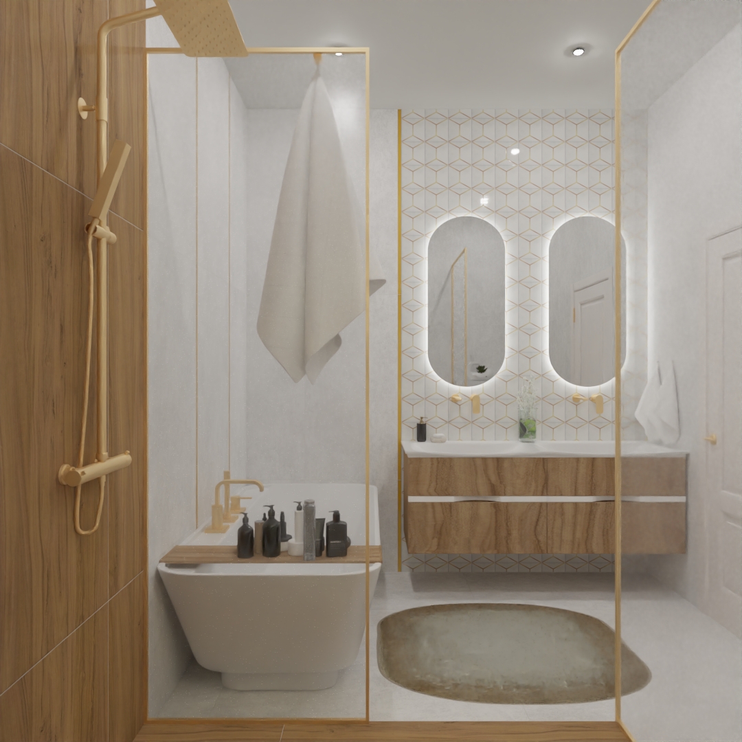 Если вы хотите добавить индивидуальности в дизайн квартир, берите на заметку этот прием. Главная изюминка нашего проекта — зона зеркал, оформленная декором Kerama Marazzi из коллекции «Витраж». Тонкий геометрический узор с благородными латунными акцентами мгновенно приковывает взгляд, превращая обычную стену в настоящее произведение искусства. Атмосферы добавляет мягкая LED-подсветка овальных зеркал, создающая уютное сияние.
