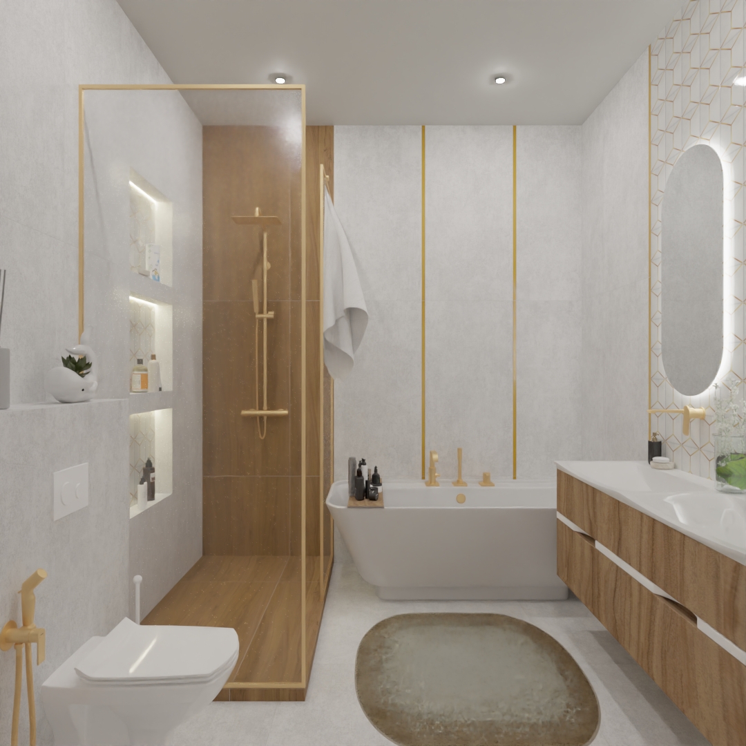 Итоговый ремонт ванной комнаты выглядит как картинка из дорогого журнала. Контраст холодного бетона и теплого дерева объединяется золотом фурнитуры, создавая целостный образ современного люкса. Здесь каждая деталь работает на общее впечатление, доказывая, что в продуманном дизайне квартир нет мелочей.