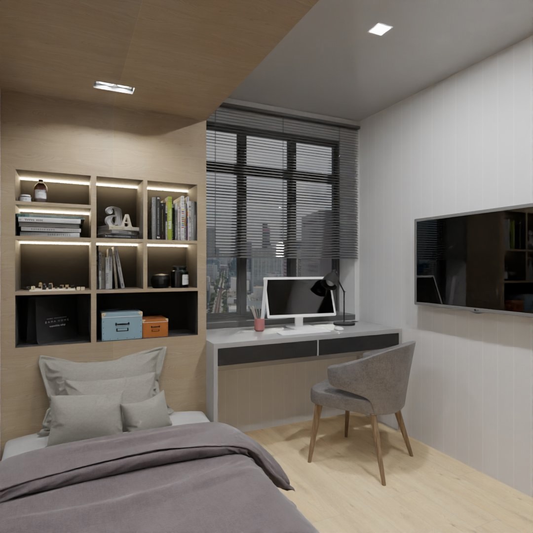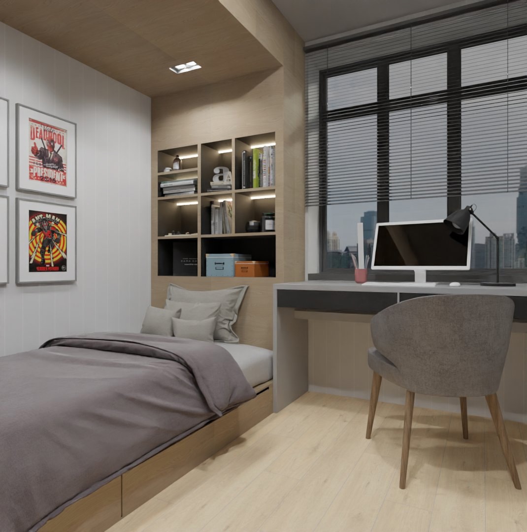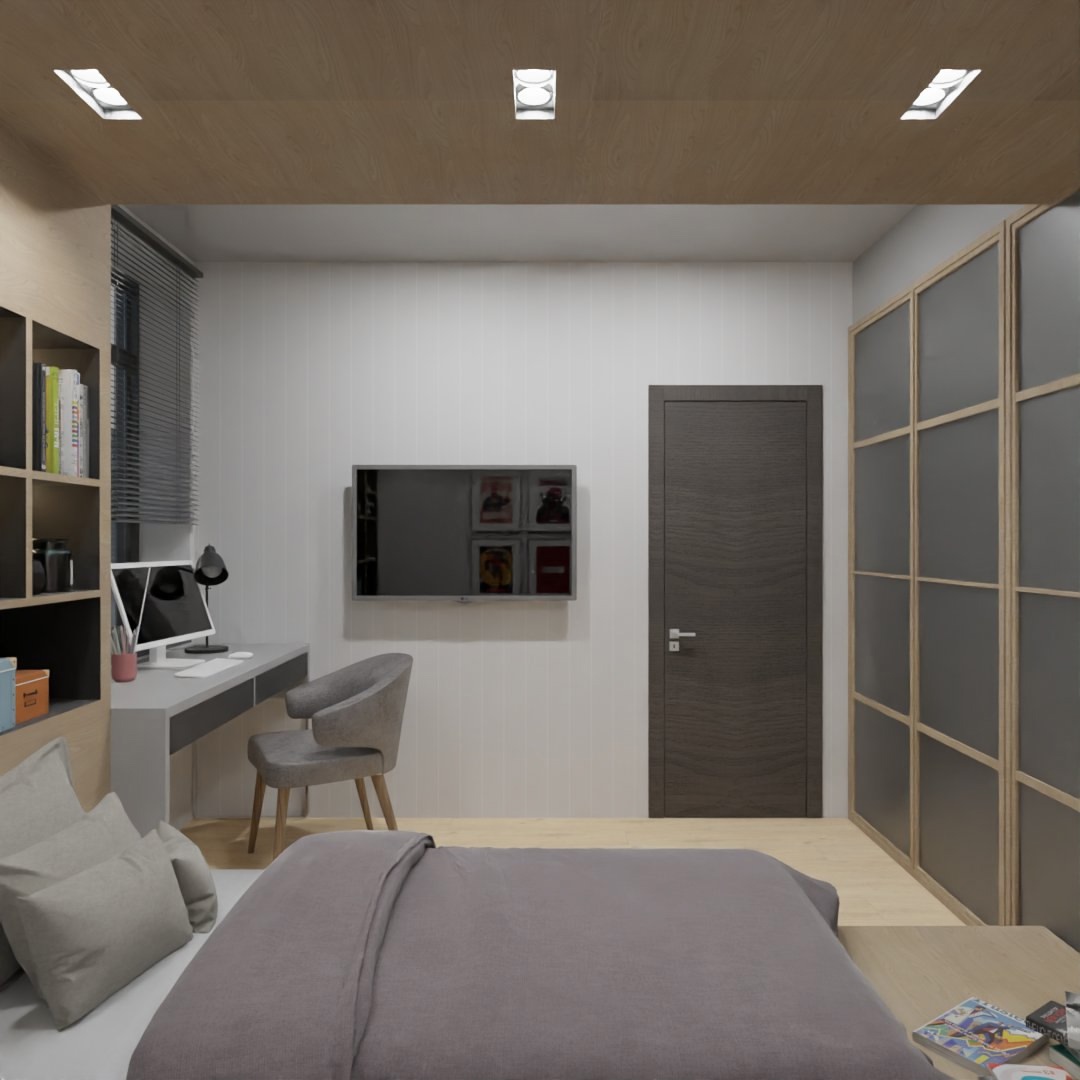 Комната выполнена в современном стиле, который сочетает функциональность и уют. Основной акцент сделан на естественные текстуры и спокойные цвета, что создает комфортную атмосферу для учёбы и отдыха.