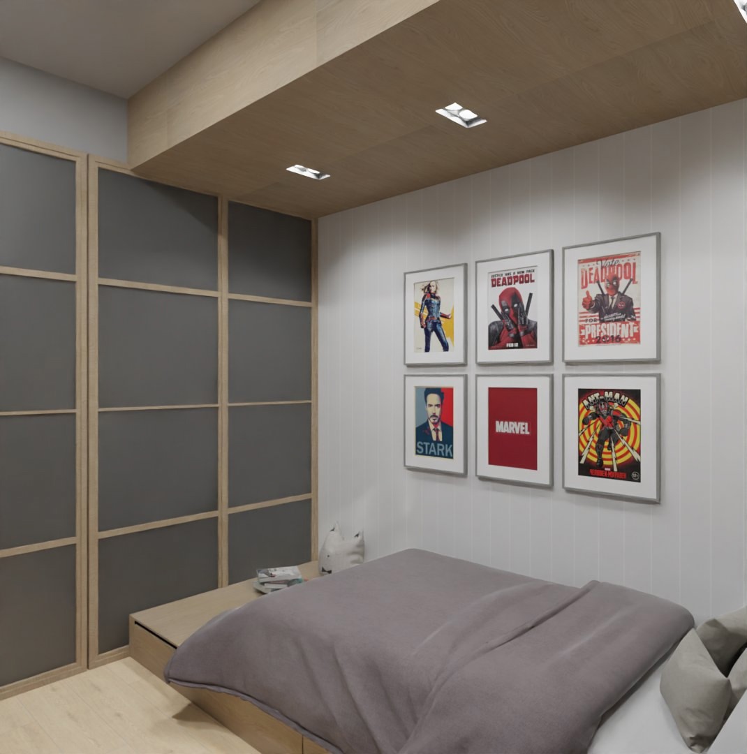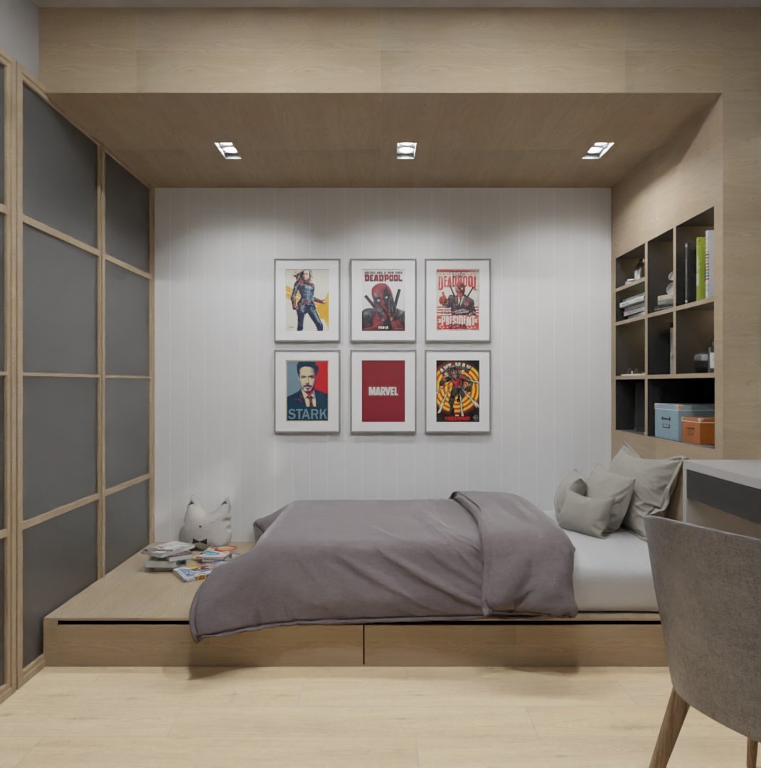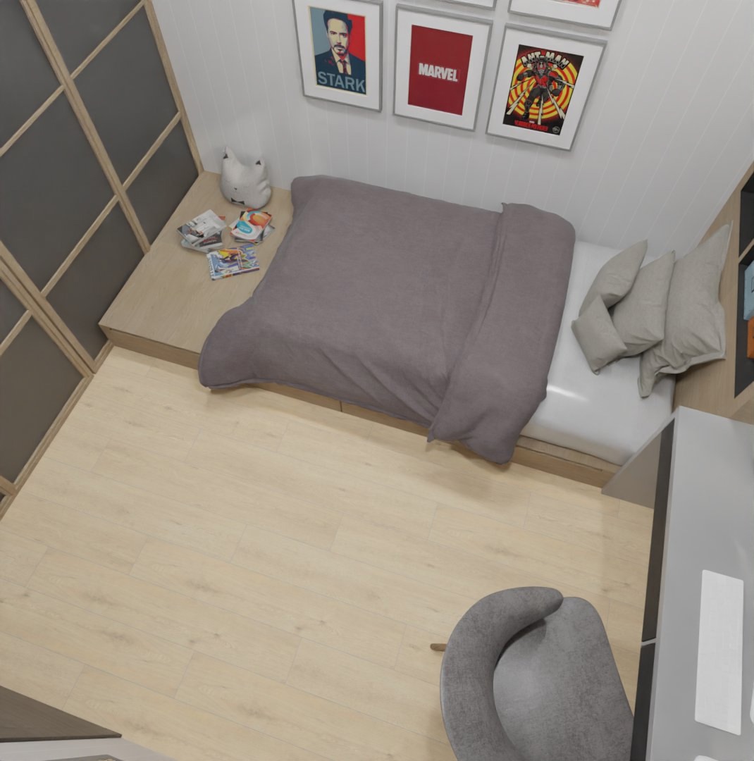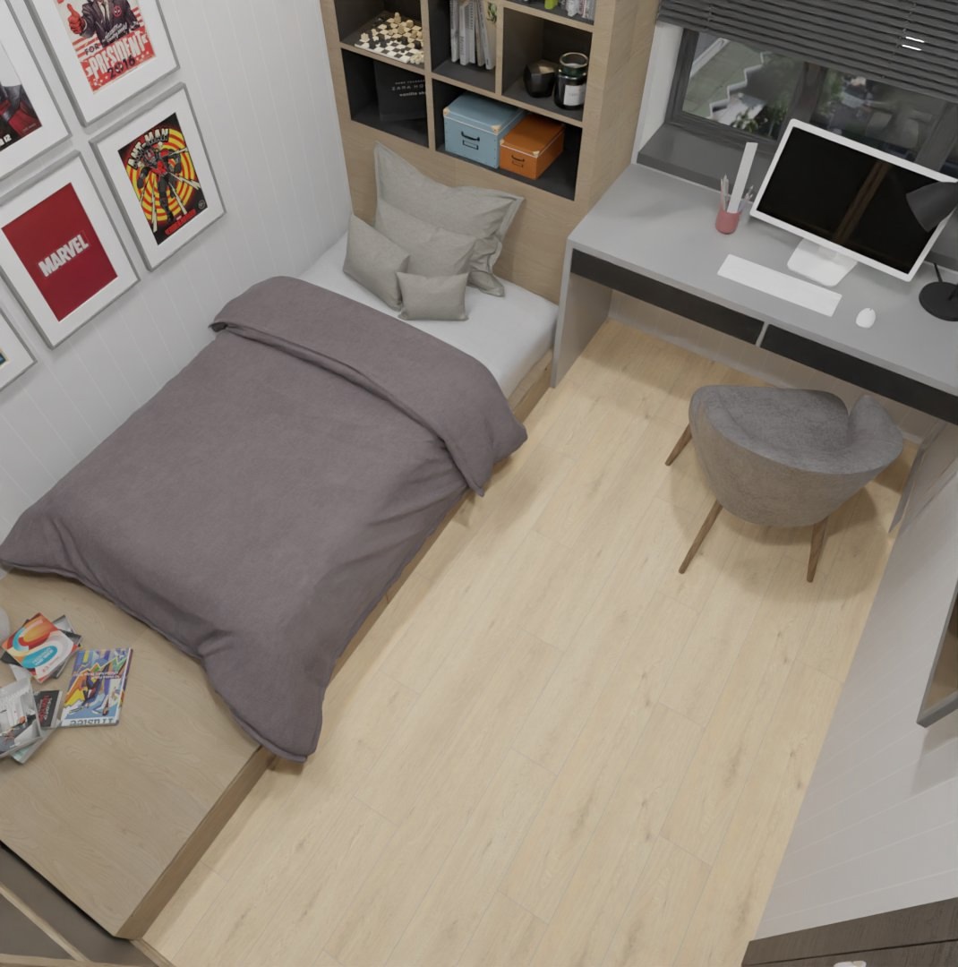 Комната выполнена в современном стиле, который сочетает функциональность и уют. Основной акцент сделан на естественные текстуры и спокойные цвета, что создает комфортную атмосферу для учёбы и отдыха.